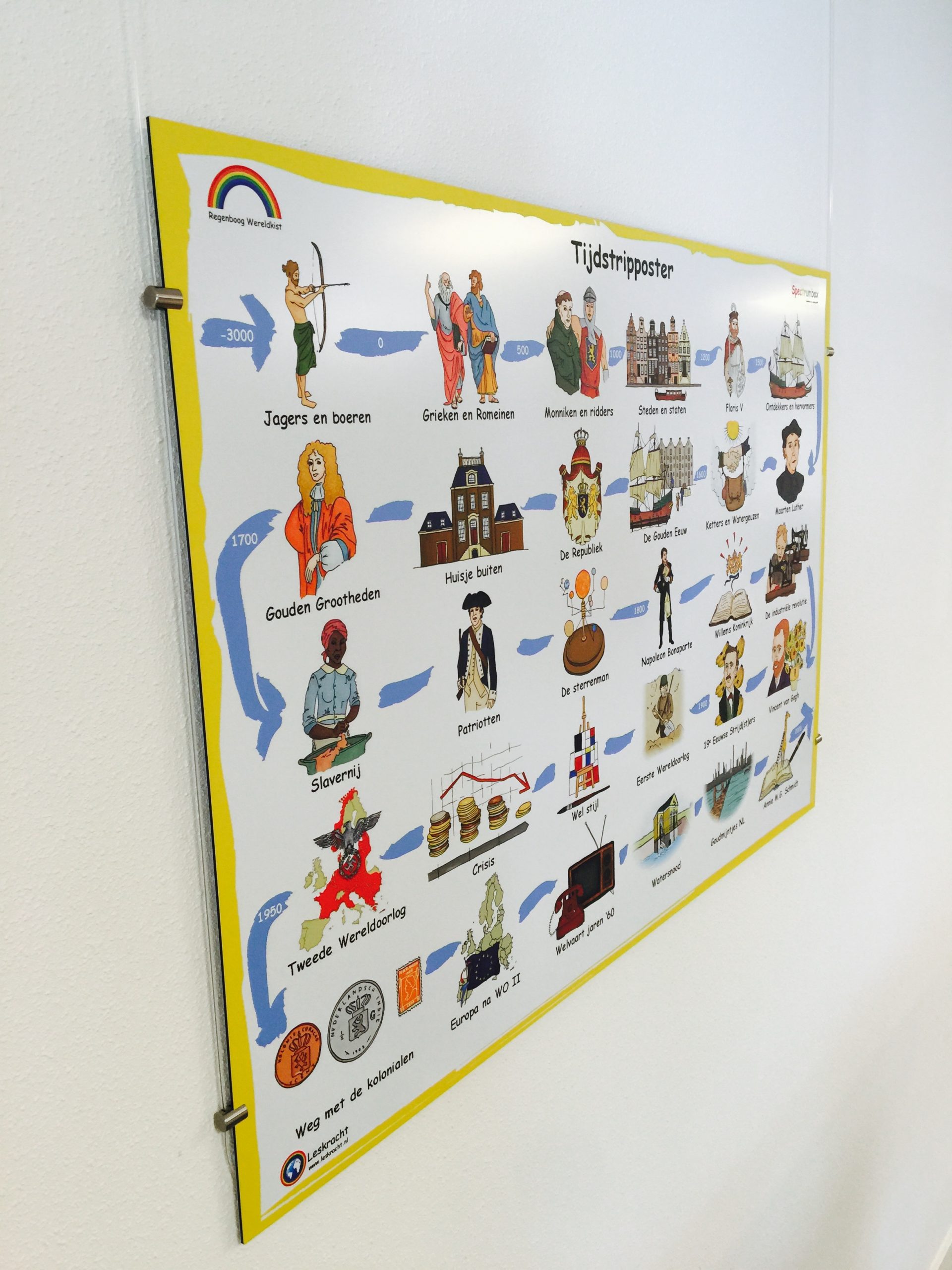 De Tijdstripposter is een illustratie van alle tijdvakken van de geschiedenis canon voor het basisonderwijs in chronologische volgorde. Binnen de online leeromgevingen van Leskracht verwijzen de illustraties naar de bijbehorende Startcards (tekstkaarten) en Biebboxen (digitale kennisbanken). Een poster aan de wand geeft leerlingen een visueel geheugensteuntje en gevoel voor tijdsbesef van de Nederlandse geschiedenis. Een digitale versie is hier te downloaden.